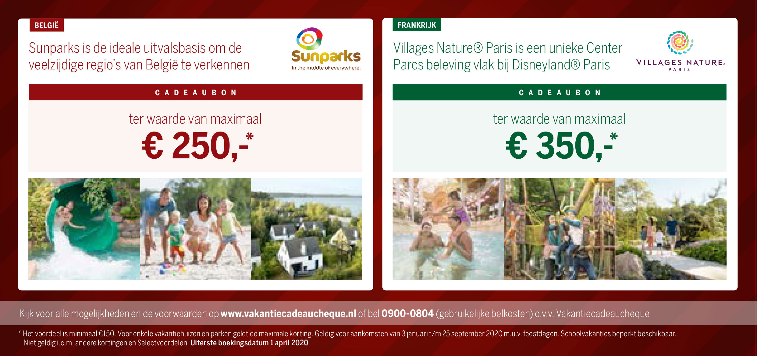 Een weekendje naar Parijs of een (mid-)weekje middenin de natuur. Met jouw cadeaubon boek je nu een heerlijk verblijf bij Center Parcs, Sunparks of Villages Nature® Paris met een korting tot €250,-. Geldig bij Center Parcs, Sunparks of Villages Nature® Paris. De waardecheques geven recht op minimaal € 150,00 korting* op uw verblijf. Kijk voor alle mogelijkheden en voorwaarden vanaf 1 december op www.vakantiekadobon.nl. Ga er lekker op uit en geniet van uw vrijheid en rust!